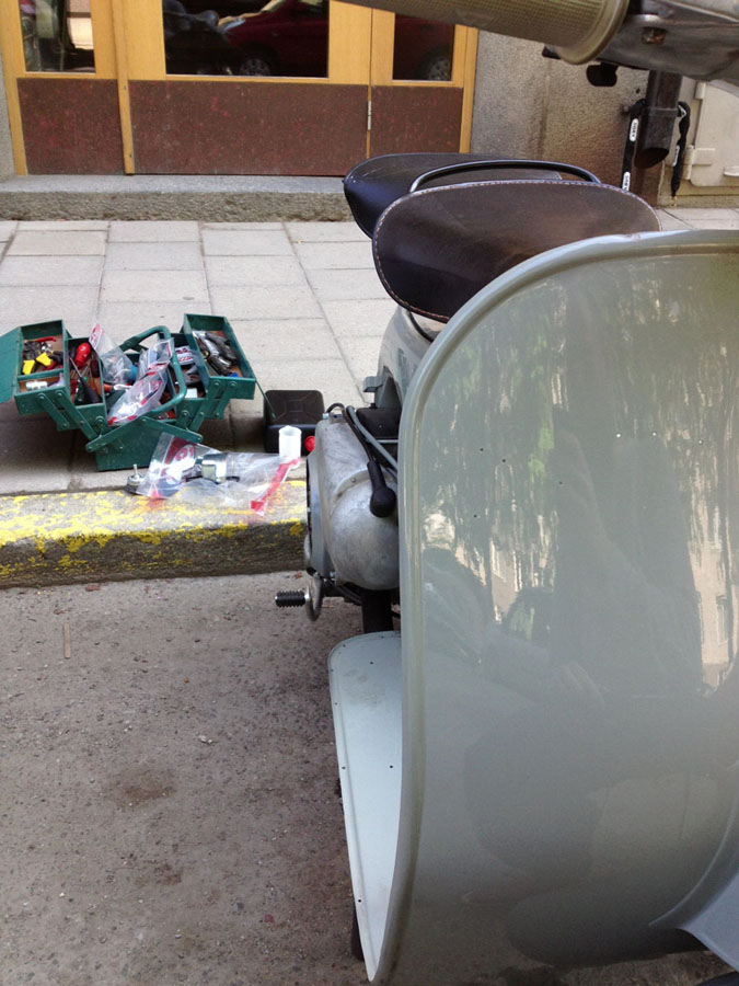 För bygget står "FixarErik" som har gjort en helt fantastiskt jobb och lite innovativa lösningar för att få P200 motorn in i ramen... mera i SSK-medlemstidningen Scooteristen.