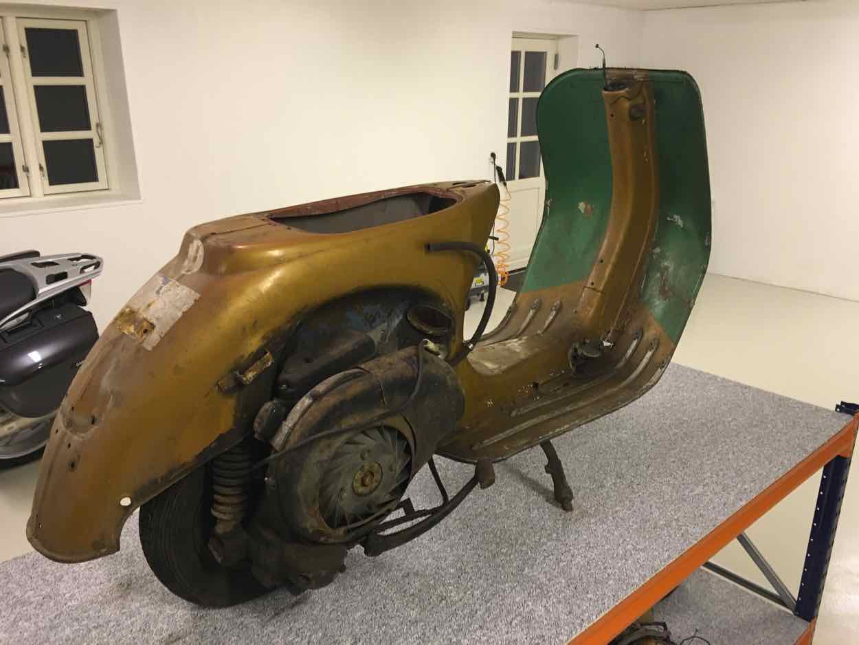 Motorn är troligast utbytt eftersom det inte står samma nummer på den som på ramen (inga matching numbers), så det går då inte att dra någon säker slutsats vilken modell av Vespa det är heller, eftersom bokstäverna på ramnumret inte syns.