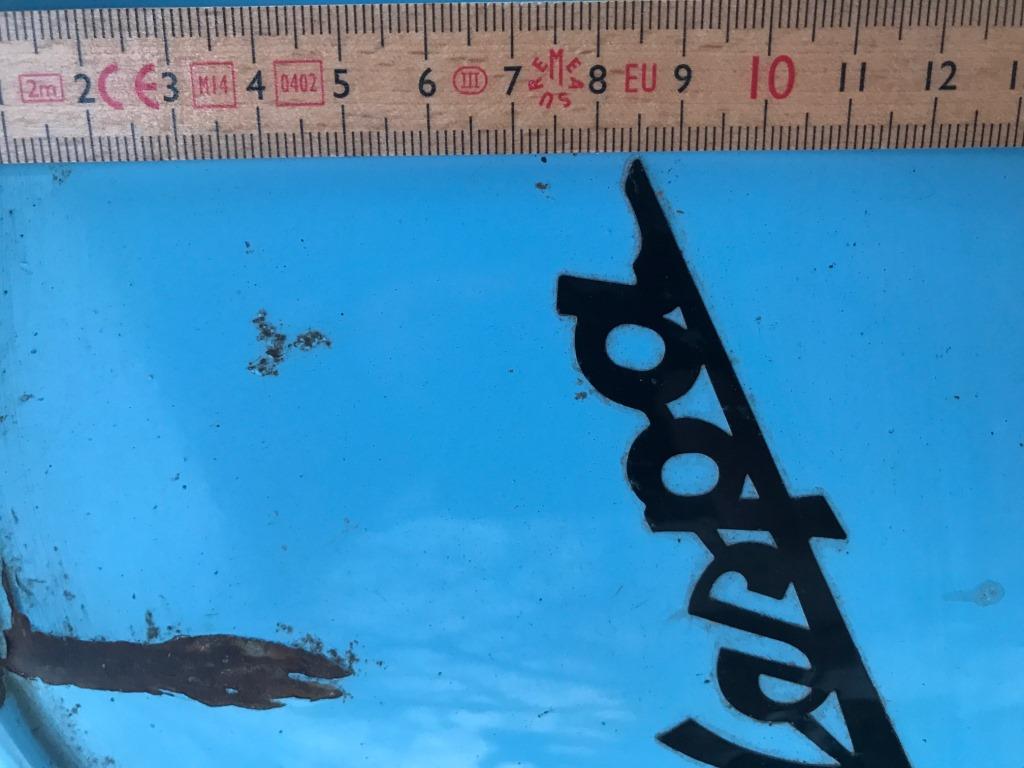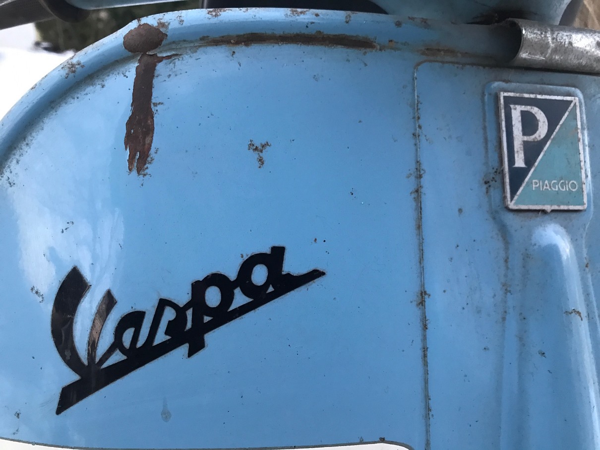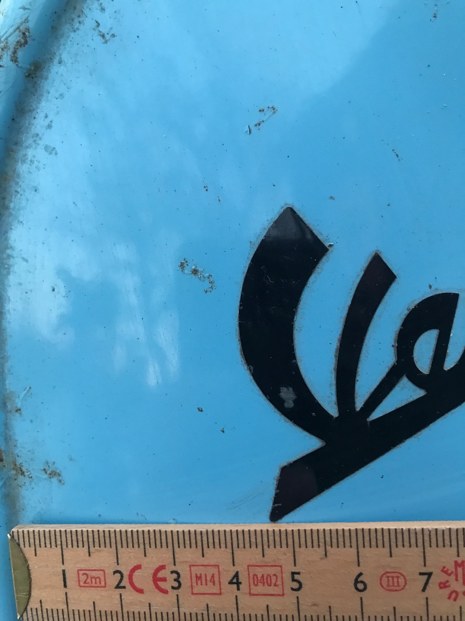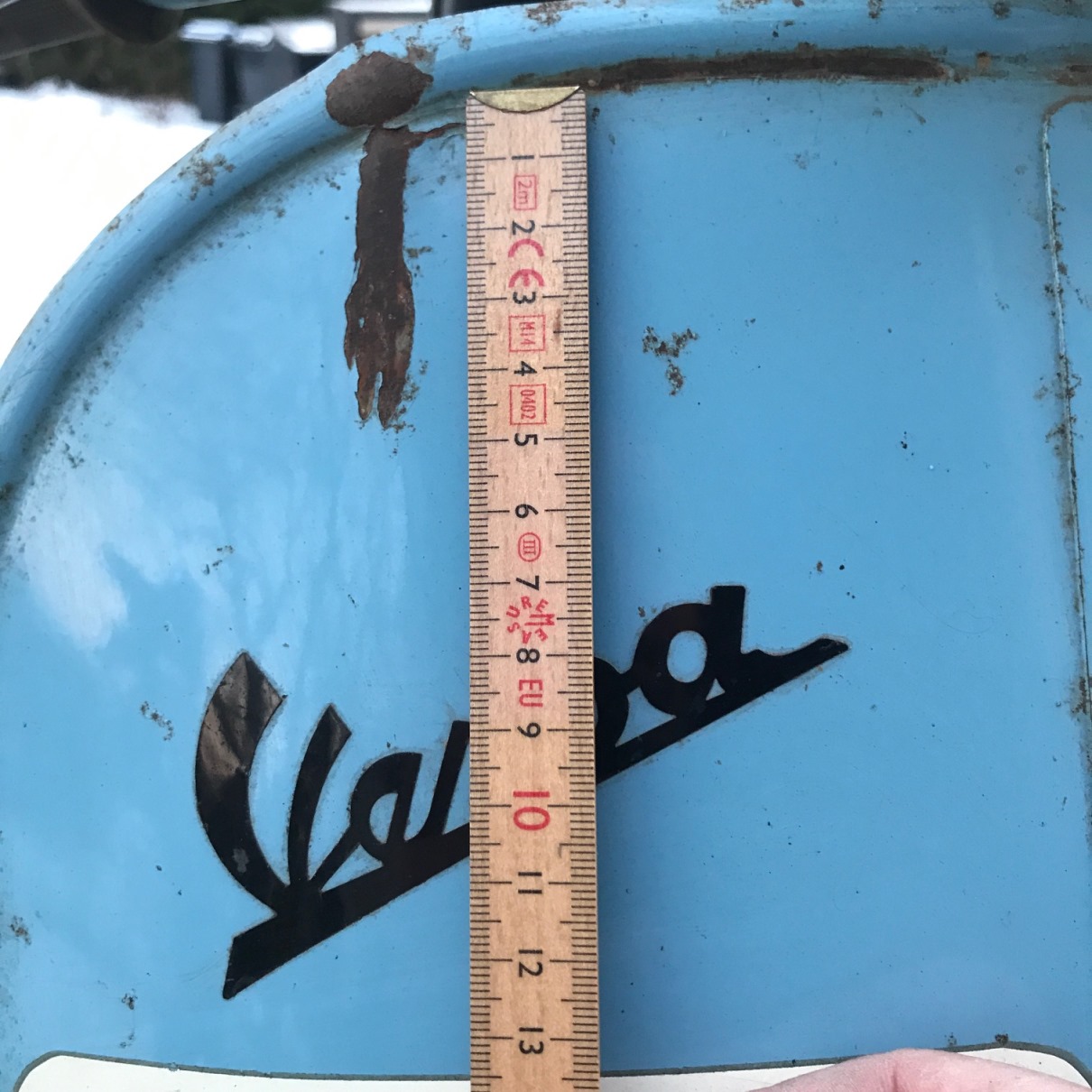 En liten renoveringsfråga till alla vespakunniga här på forumet. Det svarta (egentligen mörkt blåa) emblemet "Vespa" som ska sitta lite diagonalt på sargen framtill, är det någon som vet den exakta placeringen för detta??
