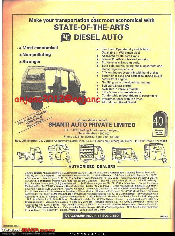 ” The Shree (श्री) three wheeler by M/s Shanti Auto Pvt Ltd, Secunderabad- this is from the 1990's. A diesel three wheeler sounded very attractive then and the only engine could be the diesel Greaves Lombardini two stroke, air-cooled single cylinder, engine also used for the diesel Bullet then. And most of all, the Delhi, Harley Davidson three wheeler taxis and later the Vikram three wheelers used these noisy and polluting engines too successfully.”