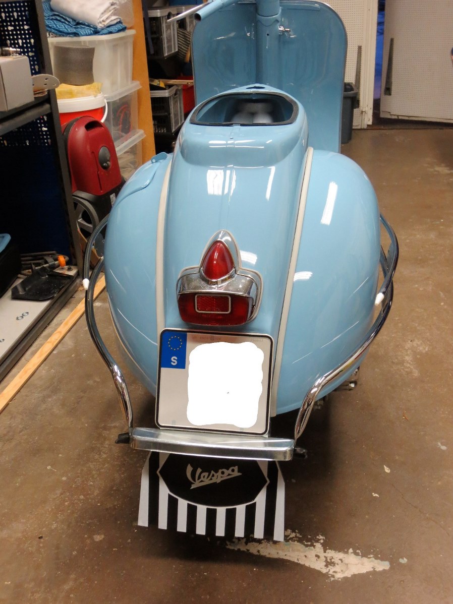 Nu har jag en fråga till er här på forumet. Det svarta (egentligen mörkt blåa) emblemet "Vespa" som ska sitta lite diagonalt på sargen framtill, är det någon som vet den exakta placeringen för detta??